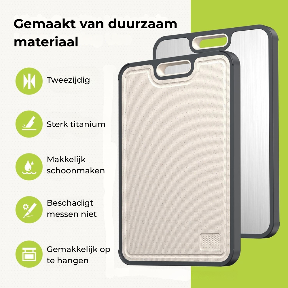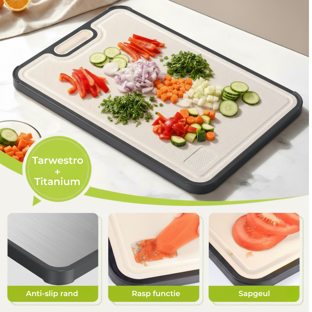 Ontdek de Titanium snijplank van Trendy Kitchen, dé slimme keuze voor iedereen die houdt van hygiënisch, duurzaam en praktisch koken. Deze innovatieve snijplank combineert een robuuste Titanium zijde met een milieuvriendelijke tarwestro zijde, voorzien van een sapgeul en geïntegreerd raspgedeelte. Ideaal voor vlees, vis, groenten en fruit. Dankzij het dubbelzijdige design houd je alles netjes gescheiden.
